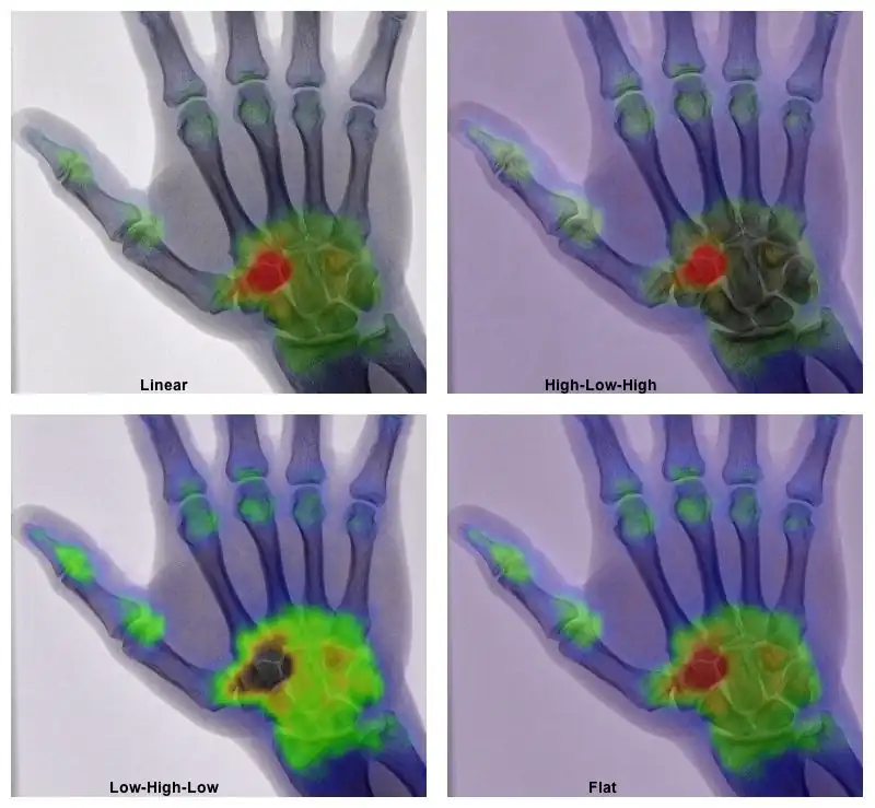 - The High-Low-High opacity function, for instance, applies a high level of opacity to pixel values at the top and bottom ends of the contrast scale of one of the images and a low opacity to intermediate pixel values. The result is improved visualization of fused data outside of hot spot regions - as illustrated in the top right panel of Figure 7.21. The Low-High-Low function has the opposite effect and generates the capability to visualize the relevant anatomical detail with a highlighted region around it - as shown in the bottom left panel of the figure. Logarithmic, exponential and other opacity functions can also be applied, depending on the nature of the two images to be fused.