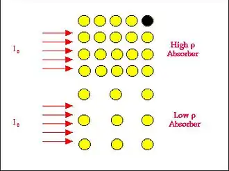 Thus a value of μ=0.01 cm-1 implies that ~1% of X-ray photons incident on an absorber of thickness 1 cm will be attenuated and 99% will be transmitted through. When μ increases to 0.5 cm-1 for an absorber of the same thickness, the transmission is ~60% (i.e. e-0.5) and the attenuation provided is therefore ~40%.