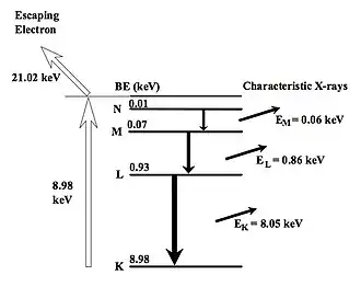 The X-rays produced by these transitions are called Characteristic Radiation because they are characteristic of the element which produces them. Thus, for example, the principal transitions in copper, whose energy level diagram is shown in Figure 1.8, are 8.97 keV (N-shell to K-shell), 8.91 keV (M-shell to K-shell) and 8.05 keV (L-shell to K-shell).