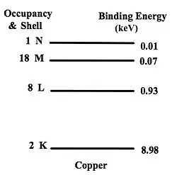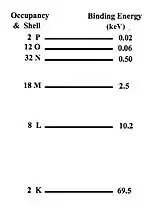 The figure shows the K-shell at the bottom with an occupancy of 2 electrons and with the greatest binding energy. Above it is the L-shell with an occupancy of 8 electrons and a lower binding energy - and so on for the other shells.