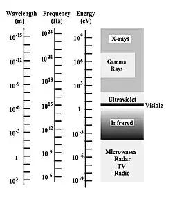 The spectrum is the broadest ranging physical phenomenon known to science. It can be seen in the figure to extend from waves with a wavelength of much greater than 1 meter to wavelengths less than a millionth, millionth, millionth of a meter. At these tiny wavelengths, the radiation can be considered to be small wave packets, which are also called photons. The spectrum can also be seen to encompass frequencies from less than a kHz to over 1024 Hz. Correspondingly, the energies range from less than 1 μeV to over 10 MeV.