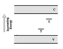 The ‘Increasing Energy’ arrow in the figure refers to the energy of the electrons. The outer-shell electrons of the crystal’s atoms are considered to occupy the valence band (V). When they leave the atom they are considered to join the conduction band (C). An energy gap exists between these two bands which normally cannot be occupied by electrons. However, impurities and lattice defects in the crystal may generate intermediate energy levels (T) which can trap electrons within the energy gap. These traps may result from the manufacturing process, for instance, or they may be designed into the crystal structure.