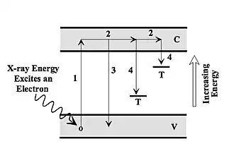 Another alternative is that the electron dropping from the conduction band gets trapped in an intermediate energy level (Process #4). The electron stays in this trap until something happens to release it - an event which is accompanied by the emission of light in some crystals. This ‘something’ can generally be provided by another form of energy, such as heat - as in thermoluminescence - or light - as in photo-stimulable luminescence. The thermoluminescent process is exploited in the thermoluminescent dosimeter (TLD) which is widely used in personal radiation monitoring. Photo-stimulable luminescence (PSL) is exploited for X-ray imaging purposes in Computed Radiography (CR).