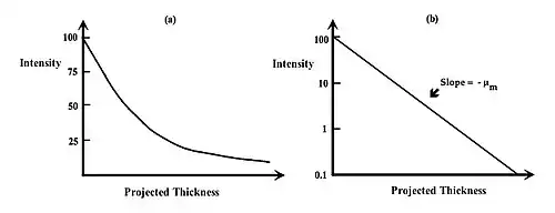 This equation can be plotted on linear/linear axes - see Figure 1.15. An exponential decrease in intensity can be seen in panel (a) in contrast to the equivalent linear decrease shown in panel (b). Note that the slope of this linear decrease is given by -μm.