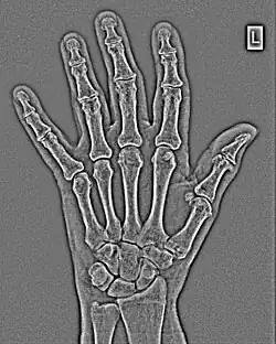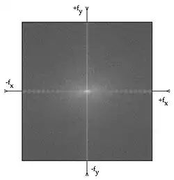 FFTs can also be calculated in two-dimensions to give results such as those in Figure 1.27. Since Fourier analysis generates results in terms of both positive and negative spatial frequencies, these can be plotted in the form of a 2D image so that the maximum frequency lies at the origin and those for the horizontal and vertical directions are shown increasing towards that origin. The modulation at different spatial frequencies is represented using a grey-scale. Low frequency bands can be seen along the horizontal axis in the figure, for example, representing the horizontal periodicity of image data from the fingers, while finer bands along the y-dimension are indicative of a periodicity of image data from the various metacarpophalangeal joints. Higher frequency features can also be seen running diagonally in this 2D-FFT, representative of the trabecular structure of the bones, for example.