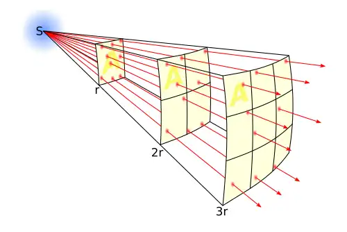 A related effect has to do with the divergent nature of X-rays beams and results in the Inverse Square Law - see Figure 1.17. Note that the intensity of the X-ray beam is reduced by this divergence by a factor directly dependent on square of the distance, r, from the radiation source, S. Therefore, if we re-position a patient three times the distance from the source, the radiation intensity will be reduced by a factor of nine and exposure factors ideally need to be increased by this factor to compensate. This law is also a fundamental tenet of radiation protection along with exposure duration and radiation shielding. We will consider such protective measures in a later chapter.