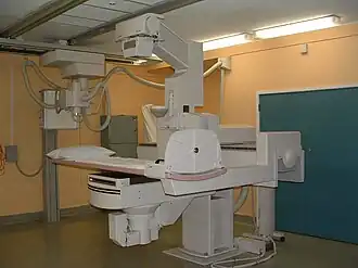 Applications areas include the oesophagus, stomach and colon (using barium-based contrast media) as well as phlebography, myelography and vascular studies (using iodine-based contrast media), urology and weight-bearing skeletal studies. Generally, the XRT, image receptor and patient table are attached to each other mechanically - see Figure 1.20 - although it is also possible for the XRT and receptor to be mounted on a structure such as a C-arm - see this photo - to allow improved flexibility.