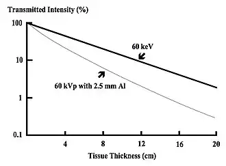 A consequence of using polychromatic X-rays is that the HVL for the range of energies needs consideration. As a result, the HVL for soft tissue in diagnostic radiography is different from that calculated in the table above, and is generally about 2.5 to 3 cm.