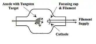 An electric current can be passed through a small filament inside a vacuum tube to produce electrons. These are formed into an electron cloud and accelerated across the tube to hit a tungsten anode. The acceleration can be provided by hooking the anode and cathode up to a high voltage supply, which can typically generate voltages in the region of 20 to 150 kV. X-rays are then produced within the tungsten target, as indicated by the short arrows in the figure.