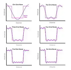 A fundamental feature of Fourier methods is that they can be used to demonstrate that any waveform can be approximated by the sum of a large number of sine waves of different frequencies and amplitudes. The converse is also true, i.e. that a composite waveform can be broken into an infinite number of constituent sine waves. This is demonstrated in Figure 1.25, where the process of adding sine waves can be seen generate reasonable approximations to a square wave. The mathematical process for identifying constituent sine waves in a composite waveform is called the Fourier Transform. It is generally calculated using a computer algorithm called the Fast Fourier Transform (FFT). The reverse process of summing such sine waves to generate a composite waveform is called the Inverse Fourier Transform - see Figure 1.26.
