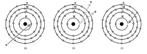 Remember from before that an ion results following the removal of an electron from an atom. We can say from this perspective that the Ionization Potential of the K-shell is 69.5 keV, while that of the L-shell is 10.2 keV - and so on. What is of interest to us here is what happens following such an ionization process.