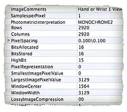 DICOM-standard images contain what is called a header file which contains information regarding the patient, the examination and the image data - a section of one is shown in the following figure as an example. Note that in this case the image data refers to a hand/wrist image which is stored at a resolution of 2,920x2,920 pixels each of size 0.1 mm. In addition, default window display settings are shown. Furthermore, the form of image compression used can be included, i.e. whether lossless, which preserves the fidelity of image data, or lossy which degrades fidelity in the interest of image transfer speeds, for instance. Numerous other parameters can also be included in a header file.