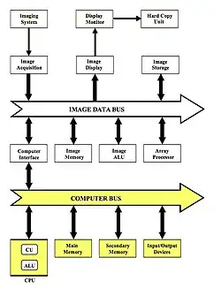 A generalised digital image processor is shown in the following figure. The yellow components at the bottom of the diagram are those of a general-purpose computer which have been described above. The digital image processing components are those which are connected to the image data bus. Each of these additional components is briefly described below.