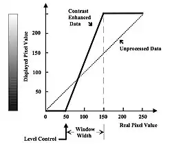 - Contrast Enhancement is a widely-used form of image processing used throughout medical imaging and will be used as an example of basic methods. This form of processing (commonly referred to as Windowing) is described below and is a form of grey-level transformation where the real pixel value is replaced by a new pixel value for display purposes. The process is generally performed using the Output Look- Up Table section of the image display component - see Figure 5.2. As a result, the original data in image memory is not affected by the process, so that from an operational viewpoint, the original image data can be readily retrieved in cases where an unsatisfactory output image is obtained. In addition, the process can be implemented at very high speed using modern electronic techniques so that, once again from an operational viewpoint, user-interactivity is possible.