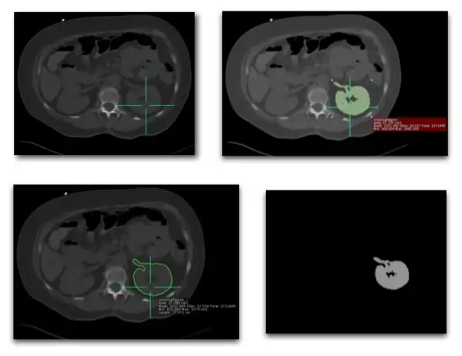- A final feature to note about volume rendering is that 3D editing techniques can be applied so as to exclude unwanted features from the computations and to expose internal structure. This is illustrated in Figure 5.29, where planes of an orthogonal frame can be moved to crop voxel data in just one direction to reveal the aorta (top right), for example, or in multiple directions to inspect the transplanted kidney (bottom right), as a second example.