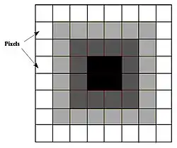 Note that each pixel represents not a point in the image but rather an element of a discrete matrix. Distance along the horizontal and vertical axes is no longer continuous, but instead proceeds in discrete steps, each given by the pixel size. With larger pixels, not only is the spatial resolution poor, since there is no detail displayed within a pixel, but grey-level discontinuities also appear at the pixel boundaries (pixelation) - see panel (b) in the figure. The spatial resolution improves with smaller pixels and a perceived lack of pixelation gives the impression of a spatially continuous image to the viewer.