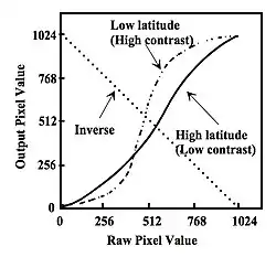 - More sophisticated look-up tables can be used for more subtle effects. Figure 5.7 shows examples for high and low latitude displays and an inverted grey-scale is also illustrated, where dark pixels can be preferentially boosted and bright pixels are suppressed.