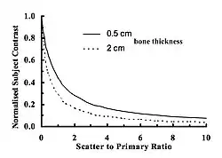 - The SPR can therefore be considered to be reasonably large in many clinical radiographs to an extent that scatter can be considerably higher in intensity than that of the transmitted primary beam which contains the radiographic attenuation information. Another perspective on this situation is shown in Figure 3.17. Here, the influence of SPR on the subject contrast of two thicknesses of bone are shown. It is seen that the even a small amount of scatter can have a significant effect on contrast. For instance, the contrast of a 2 cm thickness of bone is seen to be reduced by 50% when the SPR is just 0.6 and by about 90% when the SPR is equal to 2. We can therefore infer that even an SPR of just 2, as has been measured in the lung fields in CR chest radiography, can have a substantial influence on the contrast of attenuating lesions within those fields. It can therefore be concluded that contrast in radiographic images can be improved substantially when scattered radiation is reduced, i.e. when the SPR is improved.