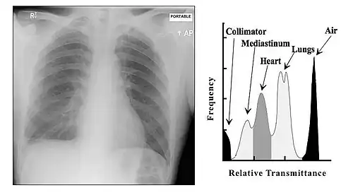 The overall effect of tissue attenuation is illustrated in the Figure 3.9 for the case of a chest radiograph. The exposed area of the patient consists in simplistic terms of air, tissues and bone and is surrounded by the rectangular collimator leaves. The air provides relatively negligible attenuation, while the bone provides substantial attenuation - and tissues provide an intermediate amount. As a result, bone can generate relatively high attenuation at lower X-ray energies and their X-rays shadows can interfere with the visualisation of the lung fields. Increasing the X-ray energy, by increasing the kV, will increase bone penetrability and reduce their shadowing effect. The overall result is a change in the prominence of features associated with different regions in the image histogram.