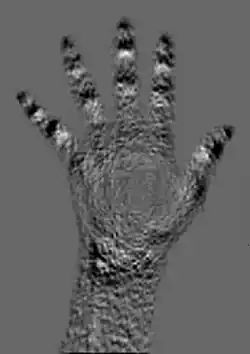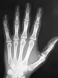 A typical image is shown in Figure 3.10. It can be seen that bone has a brighter shade of grey than that of the enveloping tissue and is brighter still than the surrounding air. This is the conventional method of displaying a radiograph such that higher photon attenuation is encoded as a brighter shade of grey.