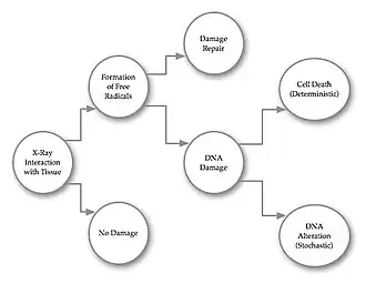 - The difference between the two effects can be considered to result because changes in single cells are sufficient to cause stochastic damage while changes in many cells are needed for deterministic effects to occur. Note that this implies that any dose of X-rays has a theoretical potential to cause cancer and that thresholds need to be exceeded before deterministic effects can occur.