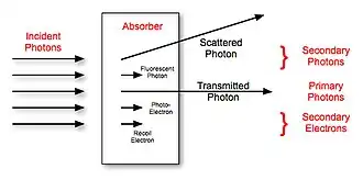 The effect of the two major interaction processes is illustrated in Figure 3.4. Photoelectric absorption of the incident photons gives rise to the generation of a photoelectrons and fluorescent X-rays, while Compton scattering generates scattered photons and recoil electrons. The transmitted photons proceed through the patient and strike the image receptor to form an image. Scattered photons can also reach the receptor - and can also be scattered in any direction around the absorber. Furthermore, some scattered photons in addition to the photoelectrons, recoil electrons and fluorescent photons loose their energy in the absorber. It is this energy loss that constitutes what is referred to as the Absorbed Dose, which we will consider in a later section of this chapter.