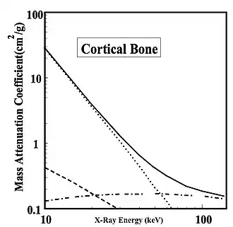 - In contrast to muscle, the situation for cortical bone is shown in Figure 3.7. Note first that the total attenuation is greater than for muscle, at all except the higher X-ray energies. Secondly, note that attenuation due to the photoelectric effect decreases, once again, almost linearly with energy and becomes less dominant than Compton scatter above about 40 keV. And thirdly, note that attenuation due to the Compton effect is reasonably constant over the energy range at, once again, ~0.2 cm2/g, while coherent scatter is quite a small percentage of the total attenuation.