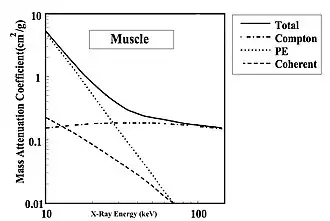 - Let's first consider the attenuation situation for muscle tissue, as shown in Figure 3.6, where its Mass Attenuation Coefficient is plotted against X-ray energy[6]. This coefficient is a measure of the attenuating ability of a material, where ‘attenuation’ is the term used to express the effects of both absorption and scattering processes.