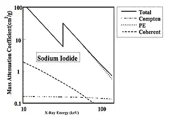 - Note also that the total attenuation in sodium iodide is about 10 times greater than cortical bone at low X-ray energies while it is about 30 times greater (and about 300 times that of muscle) at just above the K-absorption edge. This characteristic has made this material suitable as a radiation detector. It is also one of the reasons why contrast media containing iodine are used to distinguish blood vessels from surrounding tissues in angiography.