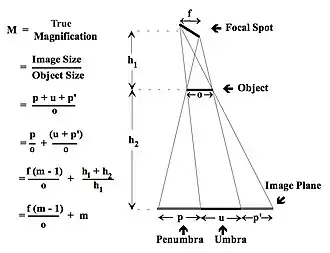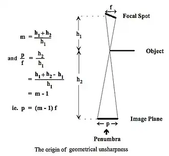 - It is found that the smaller this source, the better is the spatial resolution in the recorded radiograph. The reason can be appreciated from Figure 3.11, where it is seen that a focal spot of finite size, f, on the anode target of the X-ray tube (XRT) is used to expose the edge of a opaque object. The image of the edge is seen to be spread out into a penumbra, p, of dimensions depending on the ratio of the distance from the X-ray source to the image (the SID) and the distance from the X-ray source to the object. This ratio is called the Geometric Magnification, m. It is equivalent, on the basis of considering the geometry of this arrangement, to the image size divided by the object size.