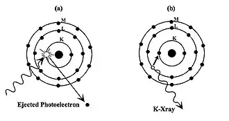 - There’s basically three major processes we need consider. Firstly, there’s the Photoelectric Effect - which is illustrated in Figure 3.1. An incoming X-ray collides with, is totally absorbed by and ejects a K-shell electron, for instance, as in panel (a). The ejected electron is called a photoelectron. The resultant vacancy in the K-shell can be filled by an electron from another shell and a K-fluorescent X-ray is generated from the transition - panel (b).