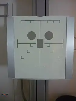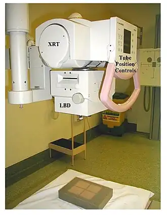 The device also generally contains an off-axis light globe with a small mirror mounted along the X-ray beam axis to reflect the light so that it mimics the dimensions of the X-ray beam. The light beam is used to set-up the field to be exposed at the patient prior to X-ray exposure and generally has crosshairs superimposed.
