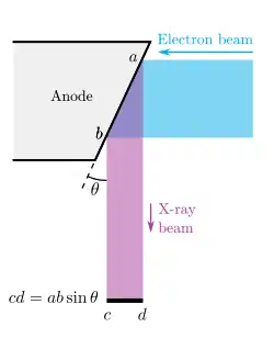 The first one is based on the Line Focus Principle and is illustrated in Figure 2.2. Here we see an exploded view of the anode surface being struck by an electron beam of height, ab. From below, the size of ab appears to be shortened to that of cd depending on the sine of the angle, θ, of the anode. The same consideration can be applied to the width of the electron beam, so that the heat it generates can as a result be dispersed over a broader region of the anode and a fine X-ray focal spot can still be obtained. The size of the electron beam focal spot is therefore reduced by angling the anode so that an apparently smaller X-ray source is obtained. This is called the effective size of the focal spot.