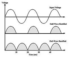 It is also seen in Figure 2.10 that full-wave rectification will provide two voltage pulses every mains period, but that the fluctuation will still remain. Note however that the length of the exposure (i.e. the exposure time) can ideally be halved to achieve an equivalent X-ray exposure as a half-wave rectified system.