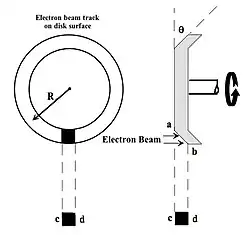 The second design feature to be incorporated is an anode rotated by an electric motor. This spins a disc of tungsten during the exposure so that the electron beam strikes an annular region of its surface rather than being concentrated into a small area, as in the stationary anode design we’ve considered up to now. The situation is illustrated in Figure 2.3 on the right where an end-on and side-on view of an anode disk is shown. Its diameter, R, can be up to 120 mm and it is generally spun at speeds of about 3,000 rpm during the exposure. A small effective focal spot can thus be obtained with the resultant heat being spread over of a broad area of anode material. The main advantage of the rotating anode XRT from a practical viewpoint is that short, intense exposures can be produced by a fine focal spot, without anode heating damaging the tube.