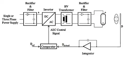 Automatic exposure control (AEC), also called Photo-Timing, is widely used in Diagnostic Radiography to terminate X-ray exposures when a reference level is reached. This reference is generally pre-defined by the exposure required at the image receptor to produce adequate radiographs. Radiation detector(s) are placed at the image receptor to measure the exposure and feed a signal back to the HV generator when termination is required.