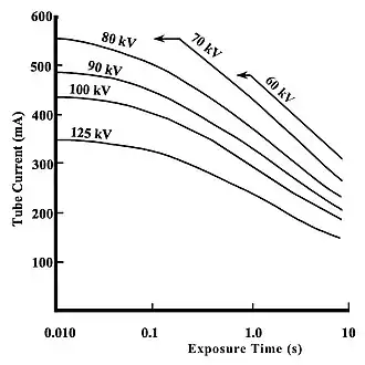 The maximum exposure time depends on factors such as the speed of the anode rotation, the size of the focal spot and the type of voltage waveform developed by the HV generator. Such information is generally provided in the form of Tube Loading Curves for each particular XRT. Curves are generally plots of the maximum exposure time for a given mA at a particular kV. An example is shown in Figure 2.7.5 where it can be seen that at 125 kV the maximum current that can be used for 0.1 s is approximately 330 mA whereas at 80 kV it is 500 mA.