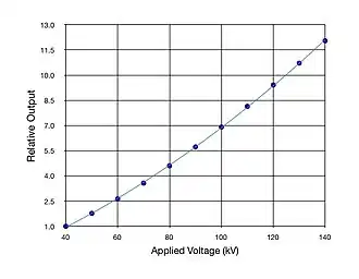 The number of X-ray photons generated at the anode is also strongly dependent on the applied voltage (i.e. the kV), with an approximately square relationship. The efficiency of an XRT for X-ray production is therefore substantially greater at the higher kilovoltages. This is illustrated in Figure 2.9.5, where the number of photons produced at 60 kV is seen to be about 2.5 times the number produced at 40 kV, while the number produced at 100 kV is almost 7 times that amount - and the number at 140 kV almost 12 times. It is important to appreciate that both the mA and the kV affect the number of X-ray photons in a beam.