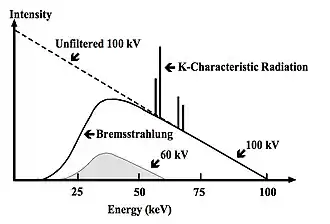 The spectrum for the 100 kV beam is seen in the figure to consist of a broad Bremsstrahlung spectrum with superimposed K-characteristic lines, as previously, but this time with low energy X-rays removed by the filtration. The beam is said to have been hardened by the filters, i.e. the average beam energy is increased. The 60 kV spectrum is seen in comparison to be of much lower intensity and to have insufficient energy to generate any K-Characteristic Radiation in the tungsten atoms.