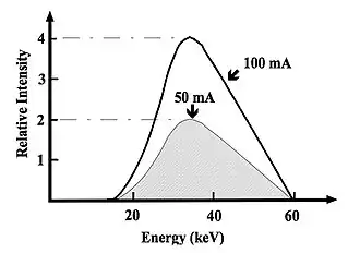The number of X-ray photons generated at the anode depends on the X-ray tube current, i.e. the mA. The effect of mA on the energy spectrum is to increase the intensity at all X-ray energies, and to otherwise leave the spectrum unchanged. This is illustrated in Figure 2.9 for the case of a 60 kV beam. Note that it is the product of tube current (mA) and the exposure time (s), i.e. the mAs, expresses the X-ray intensity generated in recording a radiograph.