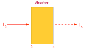 The experimental set-up is illustrated in the figure below. We refer to the intensity of the radiation which strikes the absorber as the incident intensity, I0, and the intensity of the radiation which gets through the absorber as the transmitted intensity, Ix. Notice also that the thickness of the absorber is denoted by x.