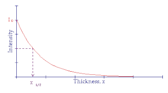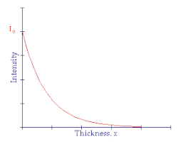 As with using the Half Life to describe the Radioactive Decay Law an indicator is usually derived from the exponential attenuation equation above which helps us think more clearly about what is going on. This indicator is called the Half Value Layer and it expresses the thickness of absorbing material which is needed to reduce the incident radiation intensity by a factor of two. From a graphical point of view we can say that when: