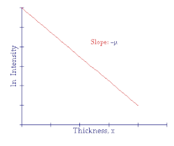 Graphical representation of the dependence of radiation intensity on the thickness of absorber: Intensity versus thickness on the left and the natural logarithm of the intensity versus thickness on the right.