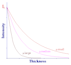 The influence of the Linear Attenuation Coefficient can be seen in the next figure. All three curves here are exponential in nature, only the Linear Attenuation Coefficient is different. Notice that when the Linear Attenuation Coefficient has a low value the curve decreases relatively slowly and when the Linear Attenuation Coefficient is large the curve decreases very quickly.