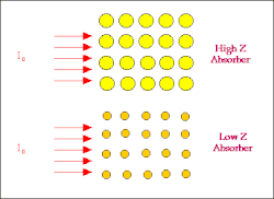 The figure illustrates a high atomic number absorber by the large circles which represent individual atoms and a low atomic number material by smaller circles. The incident radiation beam is represented by the arrows entering each absorber from the left. Notice that the atoms of the high atomic number absorber present larger targets for the radiation to strike and hence the chances for interactions via the Photoelectric and Compton Effects is relatively high. The attenuation should therefore be relatively large.