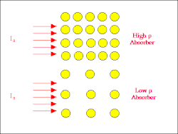 A second approach to exploring the magnitude of ∆I is to see what happens when we change the density of the absorber. We can see from the following figure that a low density absorber will give rise to less attenuation than a high density absorber since the chances of an interaction between the radiation and the atoms of the absorber are relatively lower. In addition, the density determines the transmission coefficient as it relates to the sample, since the lower the density, the higher the transmission coefficient due to the porous nature of the material.