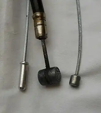 - Cable end terminals (anchors): The steel cables have welded end pieces (see image) that are shaped to fit into slots in shifters or brake levers and because cables are not interchangeable as to their purpose, there are three main types of inner-cable sold. A brake cable has either a barrel-shaped end, for bikes without drop-handlebars, or a pear-shaped end for the racing types with drop-handlebars. Cables for shifters have a button-shaped end. The free end of a cable is usually welded so that the wires cannot fray while the cable is being threaded through its housings. Some cables for brakes have a barrel at one end and a pear-termination at the other so that the user can discard the one that is not needed. These latter types are referred to as universal though the term is also used to describe some products that contain a complete brake or shifting kit that is long enough to fit most bikes.