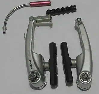 - Noodles/Transitions: Brakes arms are connected to the cable housing at the cable bridge, where a nipple on a noodle locks onto it. This fitting has a sweeping curve that allows the incoming cable direction to be changed without kinking the cable or its housing. It is either a solid noodle or is sprung. Cable housings are tightly pressed into these noodles so must be selected with the correct diameter. They are often supplied at purchase with a rubber boot, a flexible rubber piece to protect the exposed cable at the brake arm assembly.