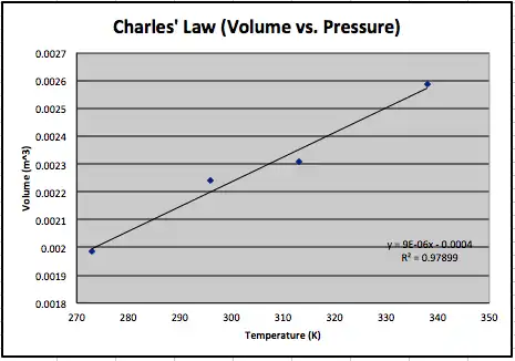 There was one more temperature that was tested, but not formally recorded. When the balloon was submersed in liquid nitrogen (a temperature of about 77 K), it seemed to have completely deflated. What really happened was that the temperature was so low that the volume decreased dramatically. When the balloon heated back up, the volume again increased back to its prior size. This can be seen in a YouTube video.