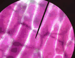 Students should focus on only the colored layer of cells. For best results focus on the cells on the edge of the sample as the salt will affect them first.